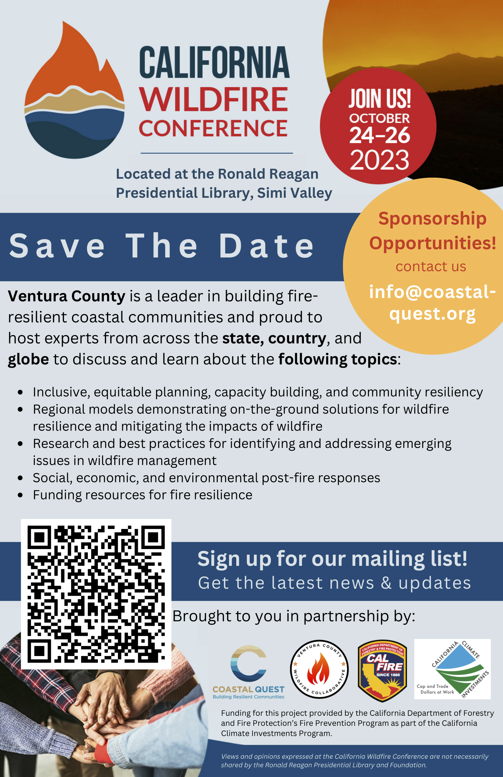 Coastal Quest, in partnership with Ventura County Wildfire Collaborative, is proud to present the first California Wildfire Conference. This three-day exchange will bring together a diverse community of wildfire practitioners to focus on understanding, preventing, and recovering from wildfires. The conference will be held from October 24-26, 2023, in Ventura County at the Ronald Reagan Presidential Library.