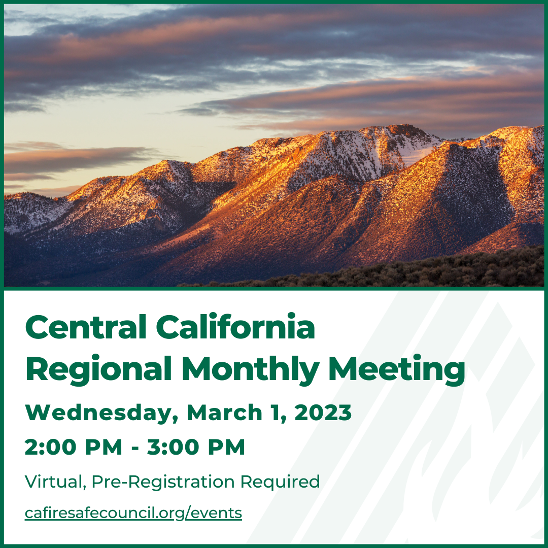 Please come join California Fire Safe Council Regional Coordinators during their monthly regional Check-ins and Networking Calls. Central California meets on the first Wednesday of each month at 2:00 PM.