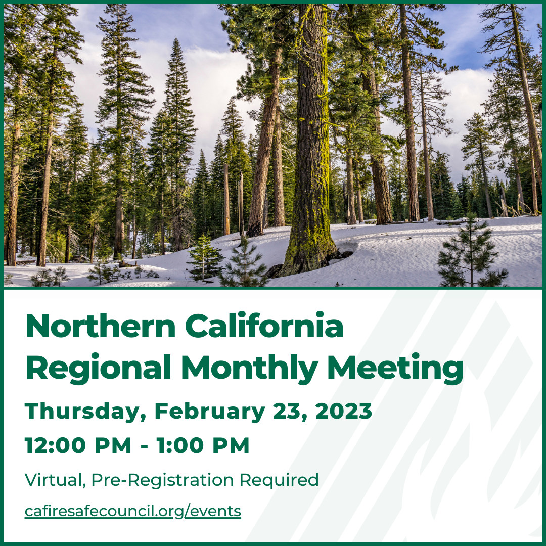 Please come join California Fire Safe Council Regional Coordinators during their monthly regional Check-ins and Networking Calls. Northern California meets on the last Thursday of each month at 12:00 PM.