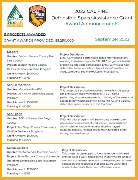 California Fire Safe Council (CFSC) is pleased to announce that eleven (11) organizations have been selected to receive grant awards for defensible space assistance projects. With funding from a 2022 CAL FIRE master grant, the CFSC will award more than $5 million to these applicants through the Defensible Space Assistance Grant Program.