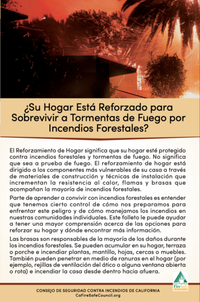 El refuerzo contra fuego significa que su hogar está preparado para un incendio forestal y un ataque de ascuas. Esto no significa que sea a prueba de incendios. El refuerzo del hogar trata los componentes más vulnerables de su hogar con materiales de construcción y técnicas de instalación que aumentan la resistencia al calor, las llamas y las ascuas que acompañan a la mayoría de los incendios forestales.
