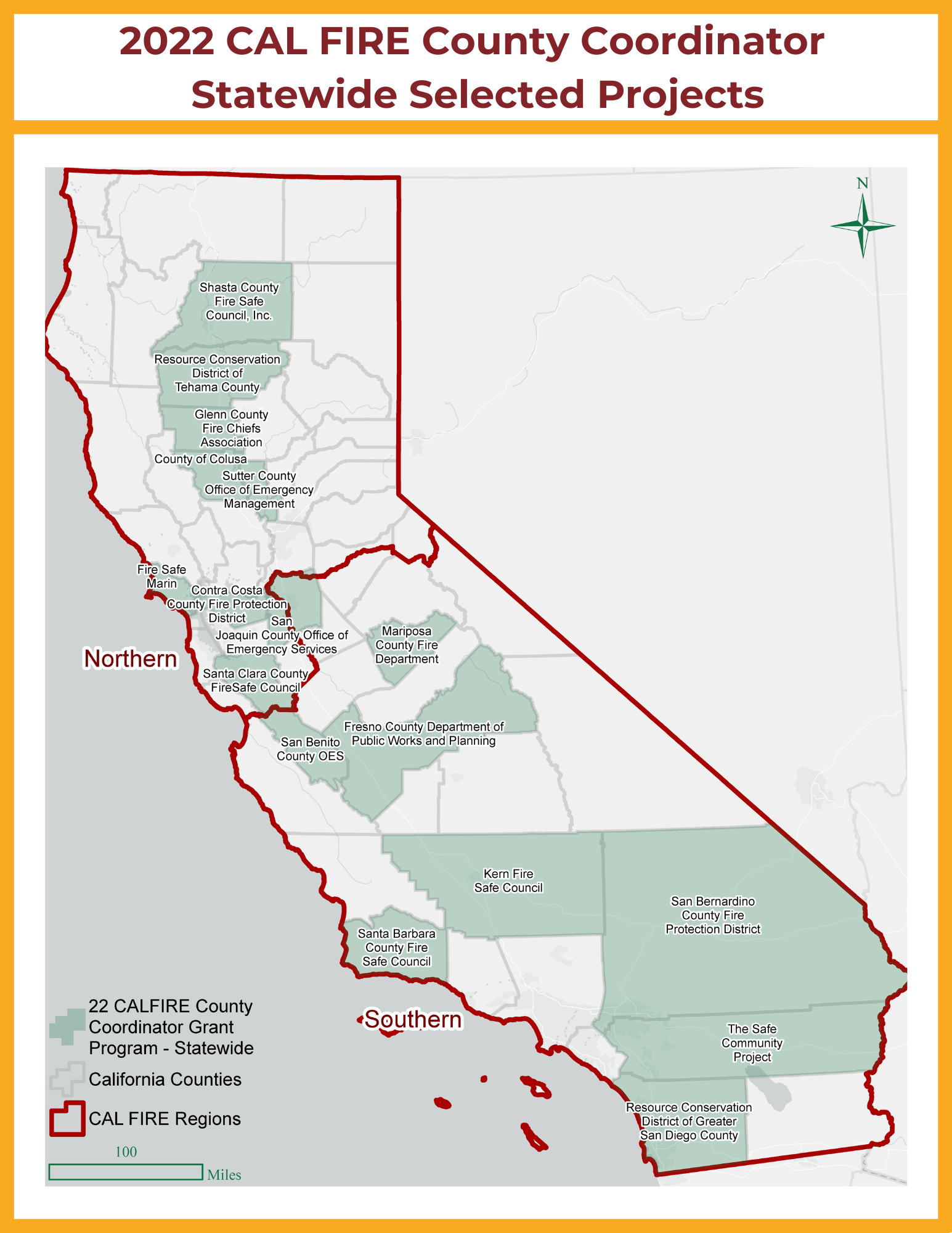 Established in 2021, the Wildfire County Coordinator Program seeks to educate, encourage, and develop countywide community collaboration and coordination among wildfire mitigation groups. The program, powered by a partnership between the California Fire Safe Council and CAL FIRE, has provided funding to 52 of California’s 58 counties to hire a Wildfire County Coordinator and establish critical local capacity to plan and implement wildfire resilience strategies on the ground.